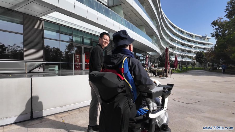 第二例侵入式脑机接口临床受试者(右)宅心念戒指轮椅,与赵郑拓接头员(左)沿途遛弯